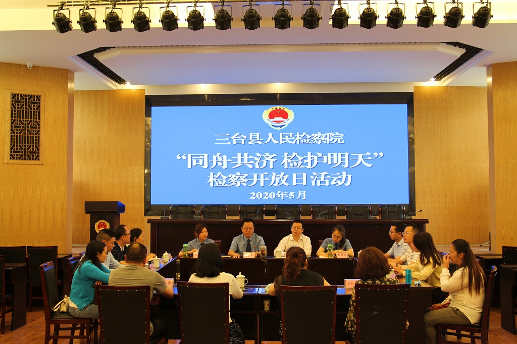 5月28日,三台县检察院开展了以“同舟共济 检护明天”为主题的检察开放日活动。此次活动邀请了县人大代表、县政协委员、县教体局、团县委相关工作人员和中小学学校负责人、老师及家长代表先后参观了案件管理办公室、视频接待室、未检办案区、警示教育基地、荣誉室等办案办公区域,并进行了座谈会。